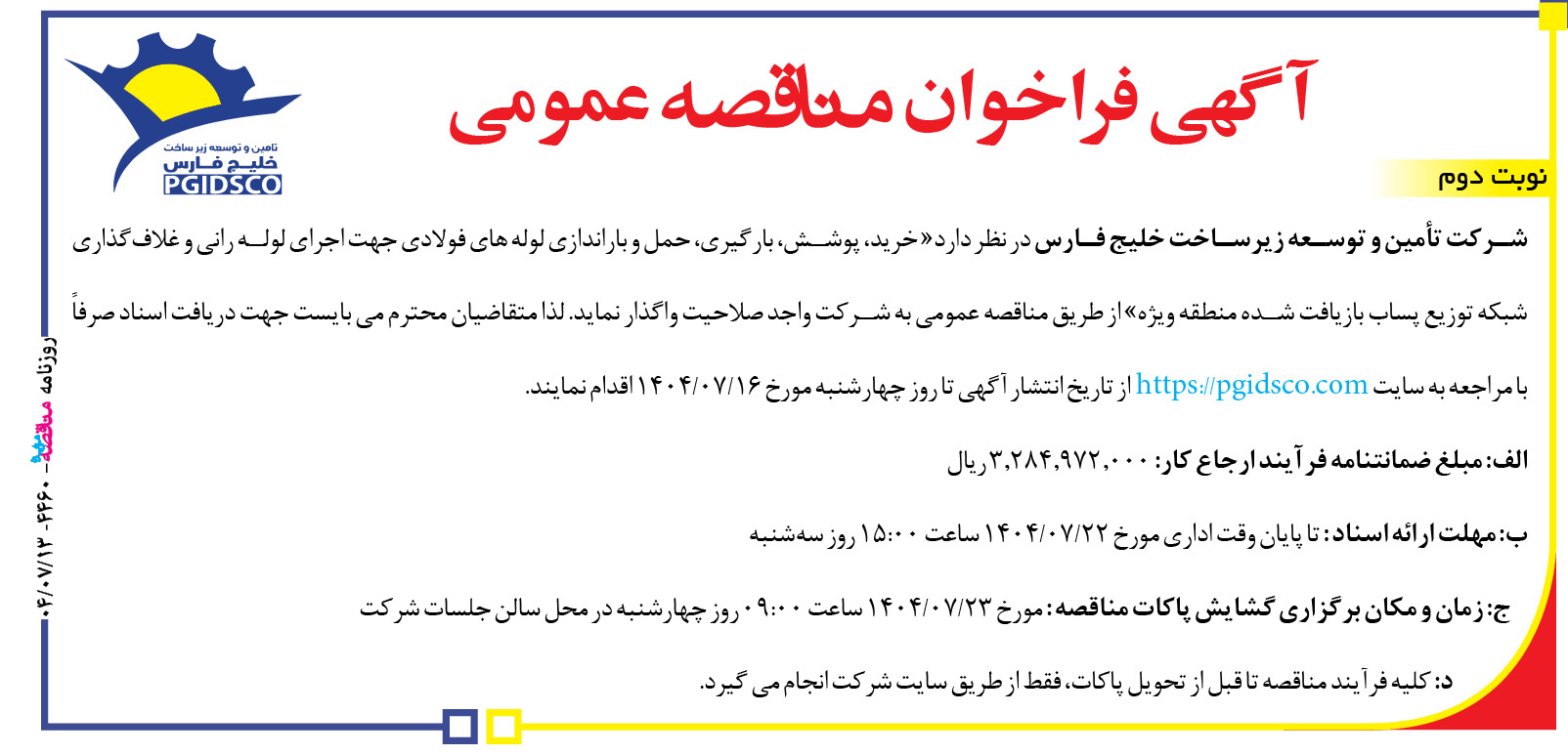 شرکت تأمین و توسعه زیرساخت خلیج فارس در نظر دارد« خرید، پوشش، بارگیری، حمل و باراندازی لوله های فولادی جهت اجرای لوله رانی و غلاف گذاری شبکه توزیع پساب بازیافت شده منطقه ویژه» از طریق مناقصه عمومی به شرکت واجد صلاحیت واگذار نماید.لذا متقاضیان محترم می بایست جهت دریافت اسناد صرفاً با مراجعه به سایت https://pgidsco.com از تاریخ انتشار آگهی تا روز چهارشنبه مورخ ۱۶/۰۷/۱۴۰۴ اقدام نمایند.