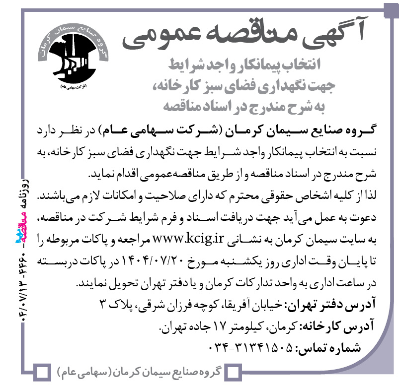 گروه صنایع سیمان کرمان (شرکت سهامی عام) در نظر دارد نسبت به انتخاب پیمانکار واجد شرایط جهت نگهداری فضای سبز کارخانه، به شرح مندرج در اسناد مناقصه و از طریق مناقصهعمومی اقدام نماید. لذا از کلیه اشخاص حقوقی محترم که دارای صلاحیت و امکانات لازم میباشند. دعوت به عمل میآید جهت دریافت اسناد و فرم شرایط شرکت در مناقصه، به سایت سیمان کرمان به نشانی www.kcig.ir مراجعه و پاکات مربوطه را تا پایان وقت اداری روز یکشنبه مورخ ۲۰/۰۷/۱۴۰۴ در پاکات دربسته در ساعت اداری به واحد تدارکات کرمان و یا دفتر تهران تحویل نمایند.