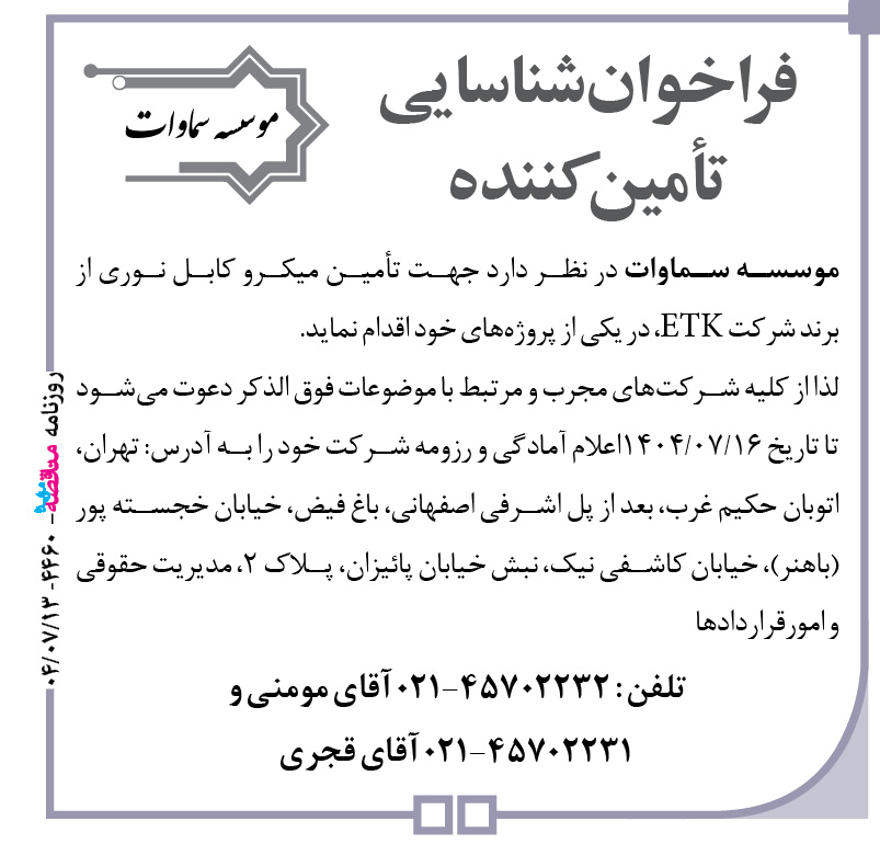 فراخوان شناسایی تامین کننده موسسه سماوات در نظر دارد جهت تأمین میکرو کابل نوری از برند شرکت ETK، در یکی از پروژههای خود اقدام نماید. لذا از کلیه شرکتهای مجرب و مرتبط با موضوعات فوق الذکر دعوت میشود تا تاریخ ۱۶/۰۷/۱۴۰۴اعلام آمادگی و رزومه شرکت خود را به آدرس: تهران، اتوبان حکیم غرب، بعد از […]