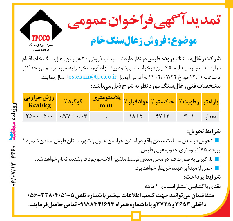 شرکت زغالسنگ پروده طبس در نظر دارد نسبت به فروش ۲۰ هزار تن زغالسنگ خام، اقدام نماید. لذا بدینوسیله از متقاضیان درخواست میشود پیشنهاد قیمت خود را بهصورت رسمی و حداکثر تا ساعت ۱۲:۰۰ مورخ ۲۴/۰۷/۱۴۰۴ به آدرس ایمیل estelam@tpc.co.ir ارسال نمایند.