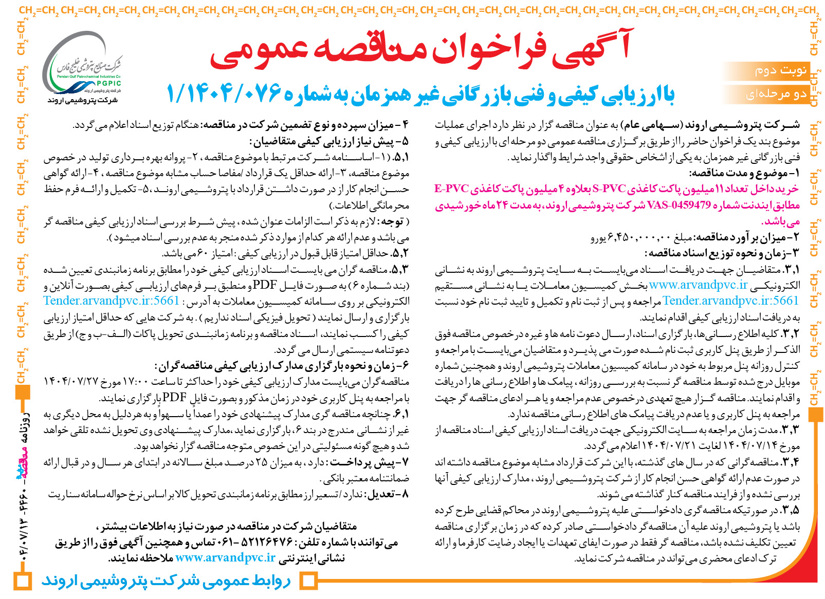فراخوان مناقصه عمومی دو مرحله ای با ارزیابی کیفی و فنی بازرگانی غیر همزمان به شماره ۰۷۶/۱۴۰۴/۱ شرکت پتروشیمی اروند (سهامی عام) به عنوان مناقصه گزار در نظر دارد اجرای عملیات موضوع بند یک فراخوان حاضر را از طریق برگزاری مناقصه عمومی دو مرحله ای با ارزیابی کیفی و فنی بازرگانی غیر همزمان به یکی […]