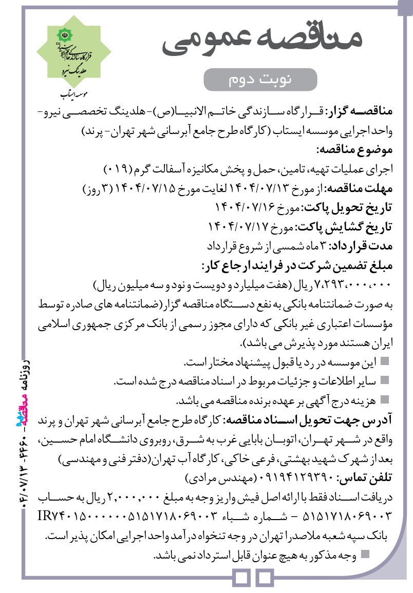 آگهی مناقصه مناقصه گزار: قرارگاه سازندگی خاتم الانبیا(ص) – هلدینگ تخصصی نیرو – واحد اجرایی موسسه ایستاب(کارگاه طرح جامع آبرسانی شهر تهران – پرند) موضوع مناقصه: اجرای عملیات تهیه، تامین، حمل و پخش مکانیزه آسفالت گرم (۰۱۹) مهلت مناقصه: از مورخ ۱۰/۰۷/۱۴۰۴ لغایت مورخ ۱۵/۰۷/۱۴۰۴ (۶ روز) تاریخ تحویل پاکت: مورخ ۱۶/۰۷/۱۴۰۴ تاریخ گشایش پاکت: […]