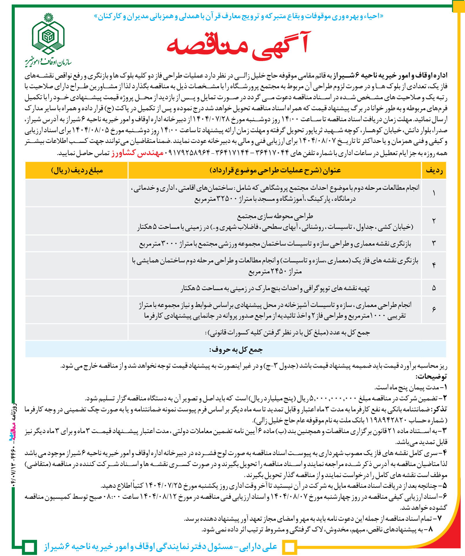 اداره اوقاف و امور خیریه ناحیه ۶ شیراز به قائم مقامی موقوفه حاج خلیل زالی در نظر دارد عملیات طراحی فاز دو کلیه بلوک ها و بازنگری و رفع نواقص نقشه های فاز یک، تعدادی از بلوک ها و در صورت لزوم طراحی آن مربوط به مجتمع پرورشگاه را با مشخصات ذیل به مناقصه بگذارد لذا از مشاورین طراح دارای صلاحیت با رتبه یک و صلاحیت های مشخص شده در اسناد مناقصه دعوت می گردد در صورت تمایل و پس از بازدید از محل پروژه قیمت پیشنهادی خود را با تکمیل فرم های مربوطه و به طور خوانا در برگ پیشنهاد قیمت که همراه اسناد مناقصه تحویل خواهد شد درج نموده و پس از تکمیل در پاکت (ج) قرار داده و همراه با سایر مدارک ارسال نمائید. مهلت زمان دریافت اسناد مناقصه تا ساعت ۱۴:۰۰ روز دوشنبه مورخ ۲۸/۰۷/۱۴۰۴ از دبیرخانه اداره اوقاف و امور خیریه ناحیه ۶ شیراز به آدرس شیراز، صدرا، بلوار دانش، خیابان کوهسار، کوچه شهید ثریاپور تحویل گرفته و مهلت زمان ارائه پیشنهاد تا ساعت ۱۴:۰۰ روز دوشنبه مورخ ۰۵/۰۸/۱۴۰۴ برای اسناد ارزیابی و کیفی و فنی همزمان و یا حداکثر تا تاریخ ۰۷/۰۸/۱۴۰۴ برای ارزیابی فنی و مالی به دبیرخانه عودت نمایند .ضمناً متقاضیان میتوانند جهت کسب اطلاعات بیشتر همه روزه به جز ایام تعطیل در ساعات اداری با شماره تلفن های ۳۶۴۱۷۰۴۴ – ۳۶۴۱۷۱۴۴ – ۰۹۱۷۹۲۵۸۹۶۴ مهندس کشاورز تماس حاصل نمایید.