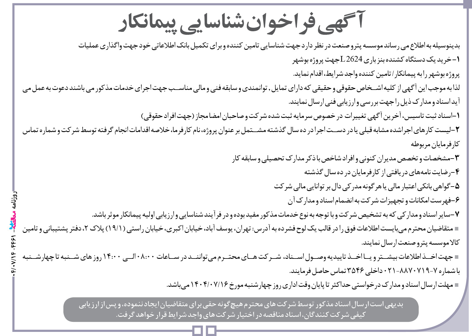 بدینوسیله به اطلاع می رساند موسسه پترو صنعت در نظر دارد جهت شناسایی تامین کننده و برای تکمیل بانک اطلاعاتی خود جهت واگذاری عملیات