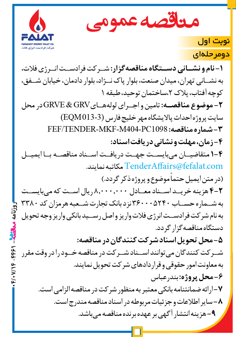 مناقصه عمومی دو مرحلهای نام و نشانی دستگاه مناقصهگزار: شرکت فرادست انرژی فلات، به نشانی تهران، میدان صنعت، بلوار پاک نژاد، بلوار دادمان، خیابان شفق، کوچه آفتاب، پلاک ۲،ساختمان توحید، طبقه ۱ موضوع مناقصه: تامین و اجرای لولههایGRVE & GRV در محل سایت پروژه احداث پالایشگاه مهر خلیج فارس (EQM 013-3) شماره مناقصه: FEF/TENDER-MKF-M404-PC1098 زمان، […]