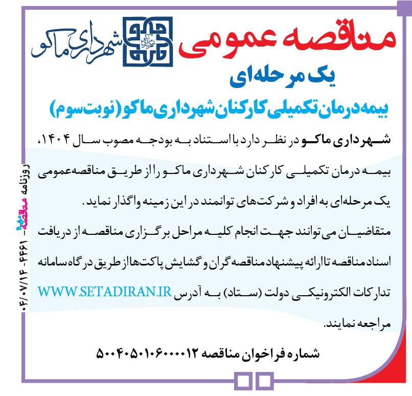 شهرداری ماکو در نظر دارد با استناد به بودجه مصوب سال ۱۴۰۴، بیمه درمان تکمیلی کارکنان شهرداری ماکو را از طریق مناقصهعمومی یک مرحلهای به افراد و شرکتهای توانمند در این زمینه واگذار نماید .