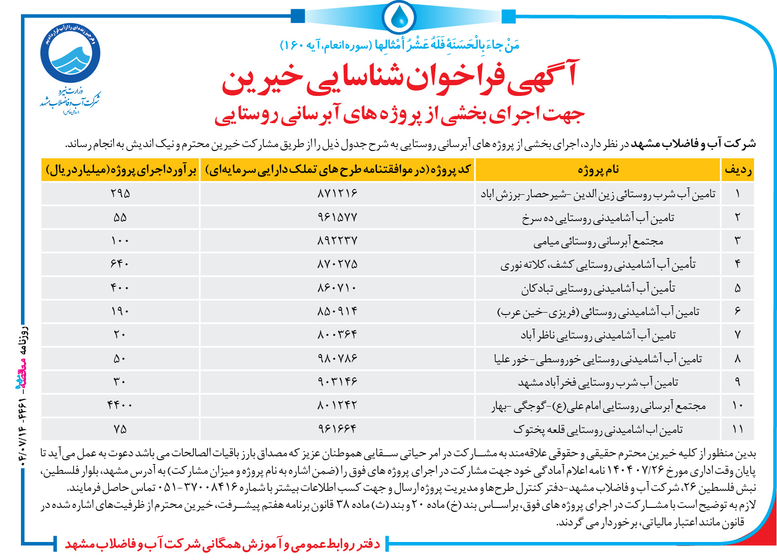 بدین منظور از کلیه خیرین محترم حقیقی و حقوقی علاقهمند به مشارکت در امر حیاتی سقایی هموطنان عزیز که مصداق بارز باقیات الصالحات می باشد دعوت به عمل میآید تا پایان وقت اداري مورخ ۲۶/۰۷ ۱۴۰۴ نامه اعلام آمادگی خود جهت مشارکت در اجرای پروژه های فوق را (ضمن اشاره به نام پروژه و میزان مشارکت) به آدرس مشهد، بلوار فلسطین، نبش فلسطین ۲۶، شرکت آب و فاضلاب مشهد-دفتر کنترل طرحها و مدیریت پروژه ارسال و جهت کسب اطلاعات بیشتر با شماره ۳۷۰۰۸۴۱۶ -۰۵۱ تماس حاصل فرمایند.
