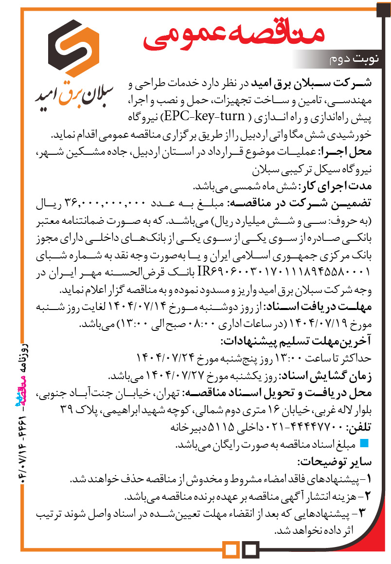 شرکت سبلان برق امید در نظر دارد خدمات طراحی و مهندسی، تامین و ساخت تجهیزات، حمل و نصب و اجرا، پیش راه اندازی و راه اندازی ( EPC-key-turn) نیروگاه خورشیدی شش مگا واتی اردبیل را از طریق برگزاری مناقصه عمومی اقدام نماید.