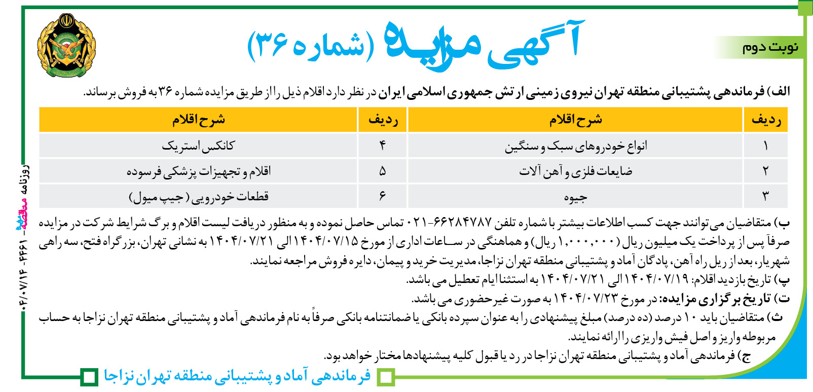 ب) متقاضیان میتوانند جهت کسب اطلاعات بیشتر با شماره تلفن ۶۶۲۸۴۷۸۷-۰۲۱ تماس حاصل نموده و به منظور دریافت لیست اقلام و برگ شرایط شرکت در مزایده صرفآ پس از پرداخت یک میلیون ریال (۱٫۰۰۰٫۰۰۰ ریال) و هماهنگی در ساعات اداری از مورخ ۱۵/۰۷/۱۴۰۴ الی ۲۱/۰۷/۱۴۰۴ به نشانی تهران، بزرگراه فتح، سه راهی شهریار، بعد از ریل راه آهن، پادگان آماد و پشتیبانی منطقه تهران نزاجا، مدیریت خرید و پیمان، دایره فروش مراجعه نمایند.
