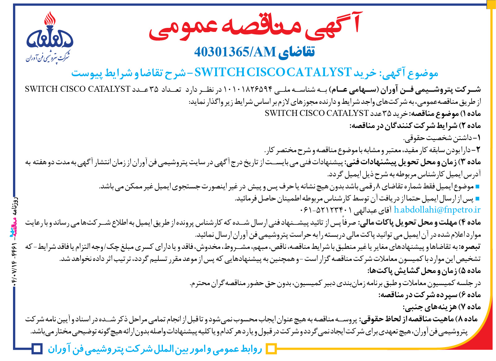 شركت پتروشيمي فن آوران (سهامی عام) به شناسه ملی ۱۰۱۰۱۸۲۶۵۹۴ در نظر دارد تعداد ۳۵ عدد SWITCH CISCO CATALYST از طريق مناقصه عمومي ، به شركتهاي واجد شرايط و دارنده مجوزهاي لازم بر اساس شرايط زير واگذار نمايد: