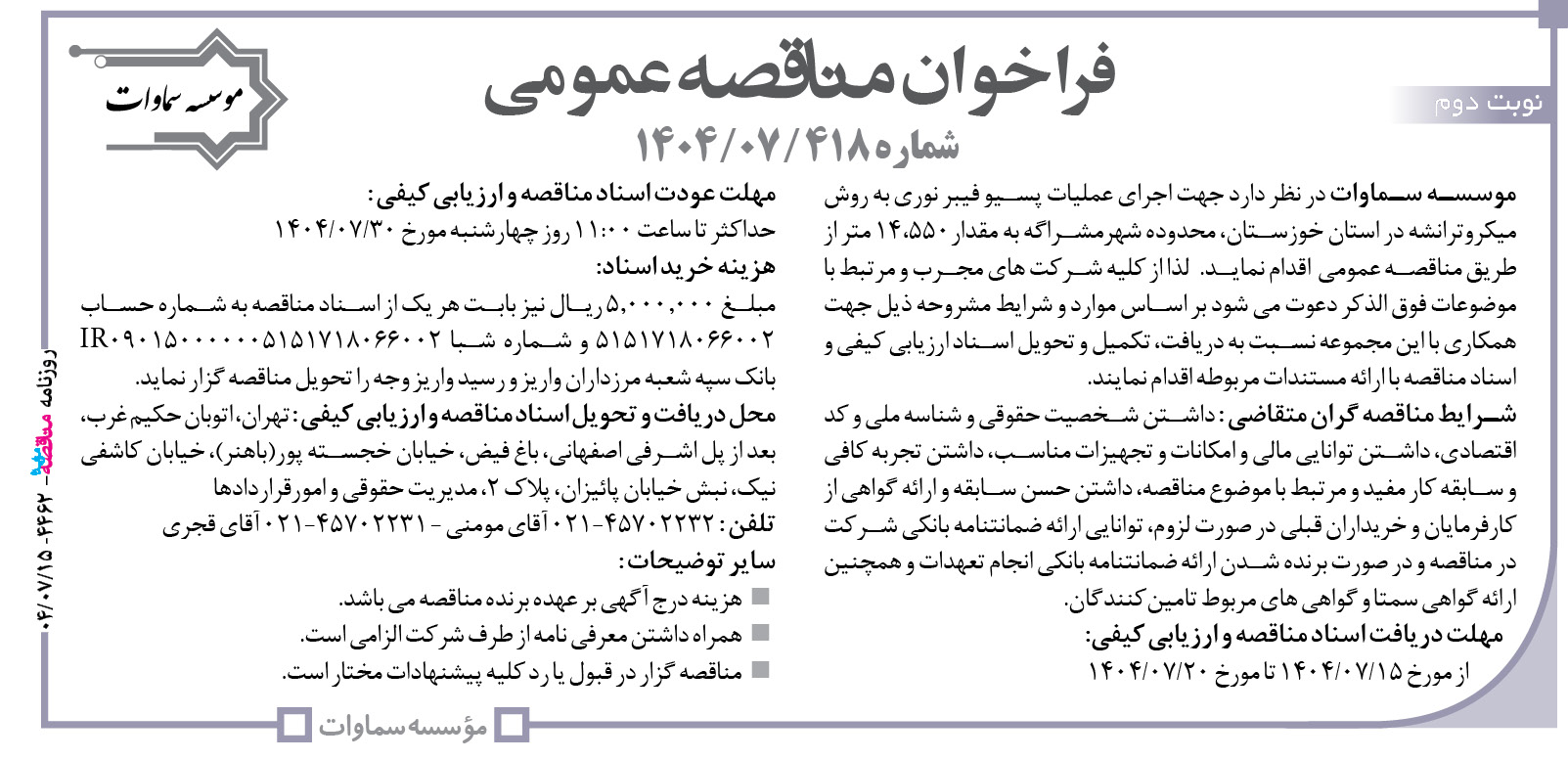 فراخوان مناقصه عمومی شماره ۴۱۸ /۰۷/۱۴۰۴