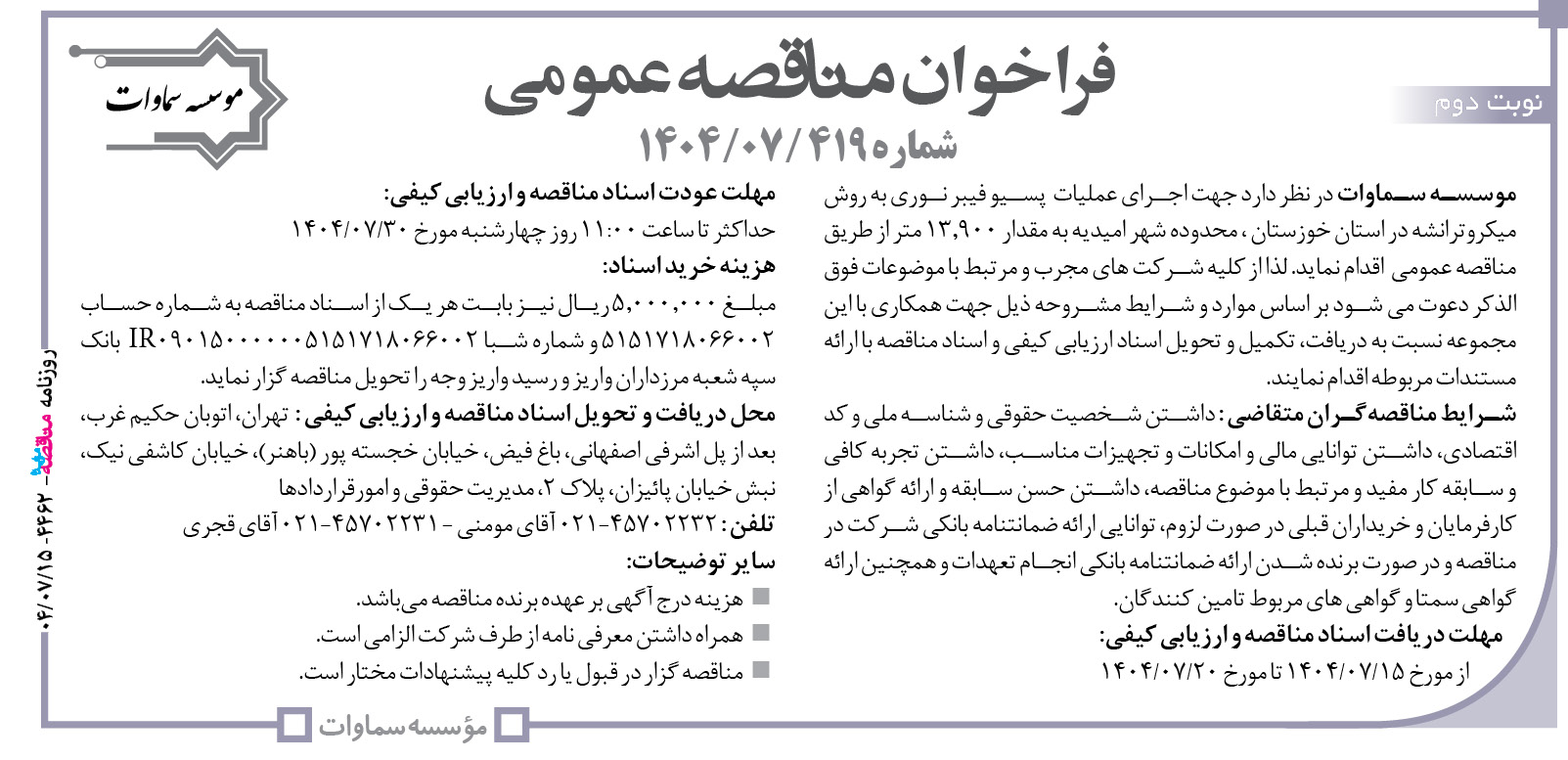 فراخوان مناقصه عمومی شماره ۴۱۹ /۰۷/۱۴۰۴