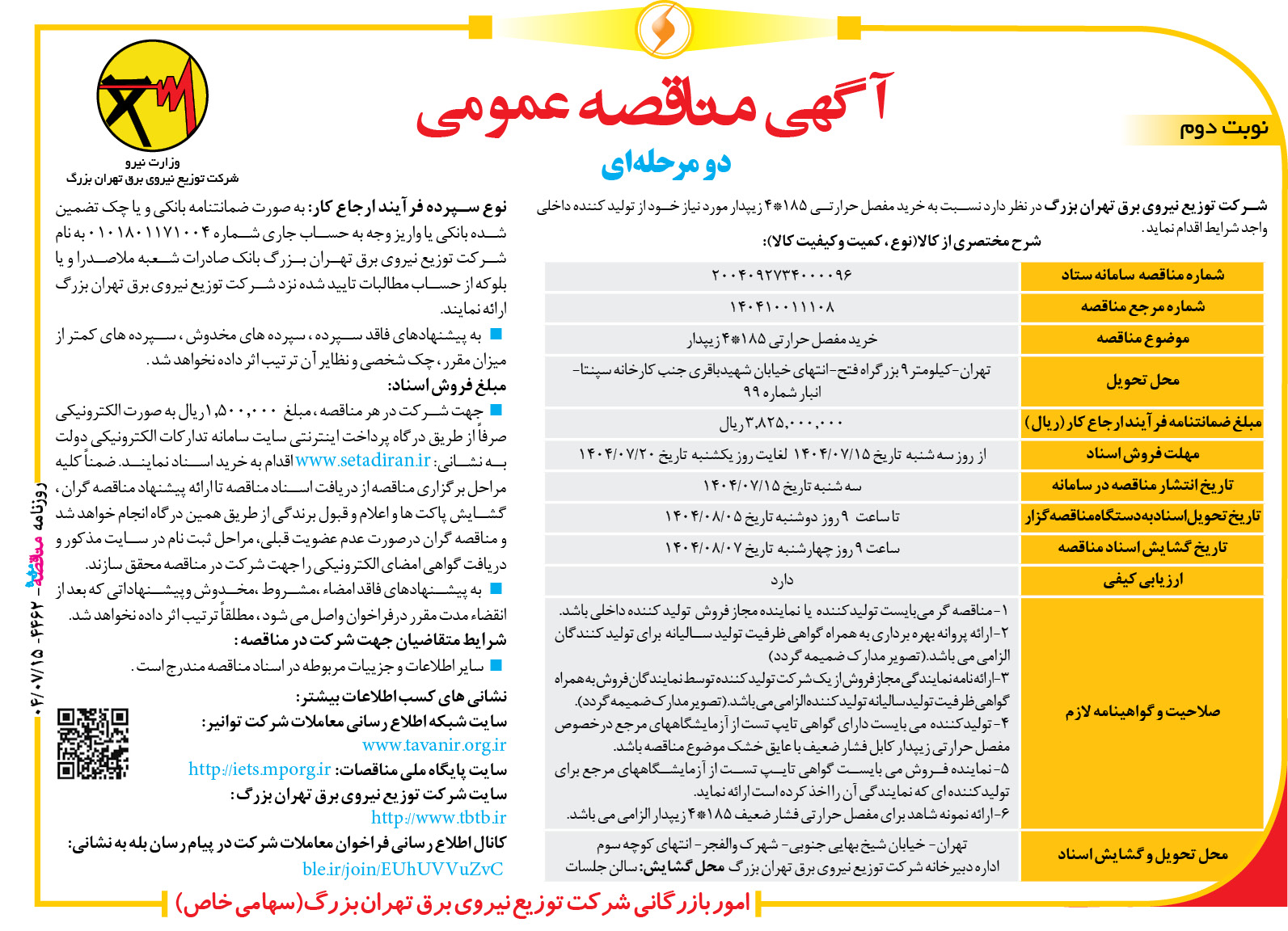 آگهي مناقصه عمومي دو مرحله اي شرکت توزیع نیروی برق تهران بزرگ در نظر دارد نسبت به خرید مفصل حرارتی ۱۸۵*۴ زیپدار مورد نیاز خود از تولید کننده داخلی واجد شرایط اقدام نماید . شرح مختصري از كالا(نوع ، كميت وكيفيت كالا): شماره مناقصه سامانه ستاد ۲۰۰۴۰۹۲۷۳۴۰۰۰۰۹۶ شماره مرجع مناقصه ۱۴۰۴۱۰۰۱۱۱۰۸ موضوع مناقصه خرید مفصل […]