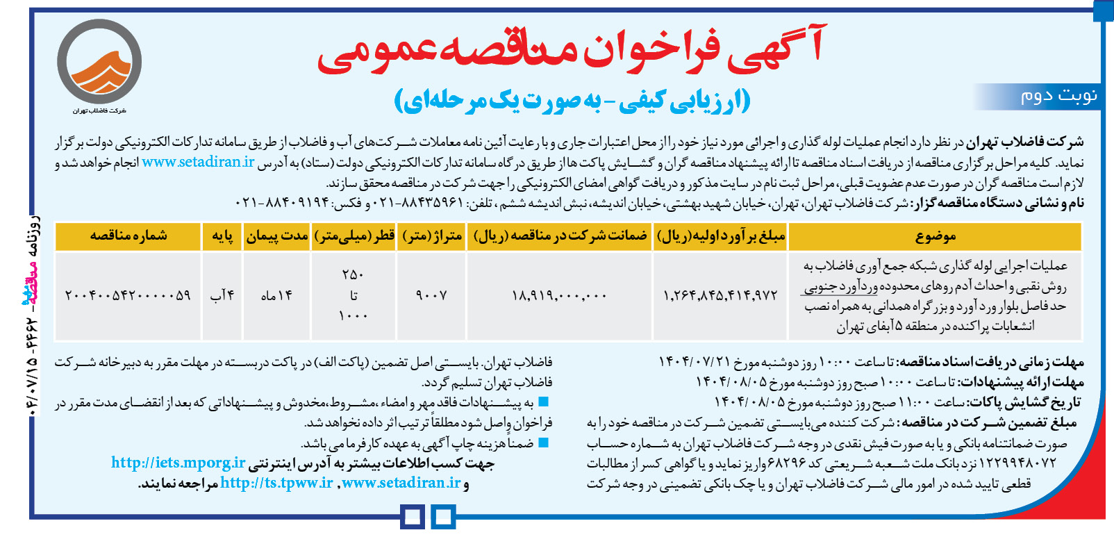 شركت فاضلاب تهران در نظر دارد انجام عملیات لوله گذاری و اجرائی مورد نیاز خود را از محل اعتبارات جاری و با رعايت آئین نامه معاملات شرکتهای آب و فاضلاب از طریق سامانه تدارکات الکترونیکی دولت برگزار نماید. کلیه مراحل برگزاری مناقصه از دریافت اسناد مناقصه تا ارائه پیشنهاد مناقصه گران و گشایش پاکت ها از طریق درگاه سامانه تدارکات الکترونیکی دولت (ستاد) به آدرس www.setadiran.ir انجام خواهد شد و لازم است مناقصه گران در صورت عدم عضویت قبلی، مراحل ثبت نام در سایت مذکور و دریافت گواهی امضای الکترونیکی را جهت شرکت در مناقصه محقق سازند.