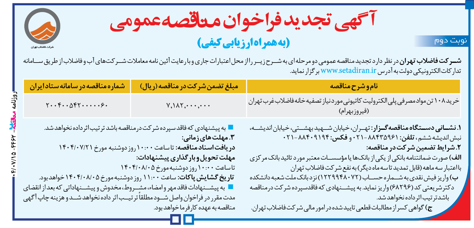 شركت فاضلاب تهران در نظر دارد تجدید مناقصه عمومی دو مرحله ای به شرح زیر را از محل اعتبارات جاری و با رعايت آئین نامه معاملات شرکتهای آب و فاضلاب از طریق سامانه تدارکات الکترونیکی دولت به آدرس www.setadiran.ir برگزار نماید.