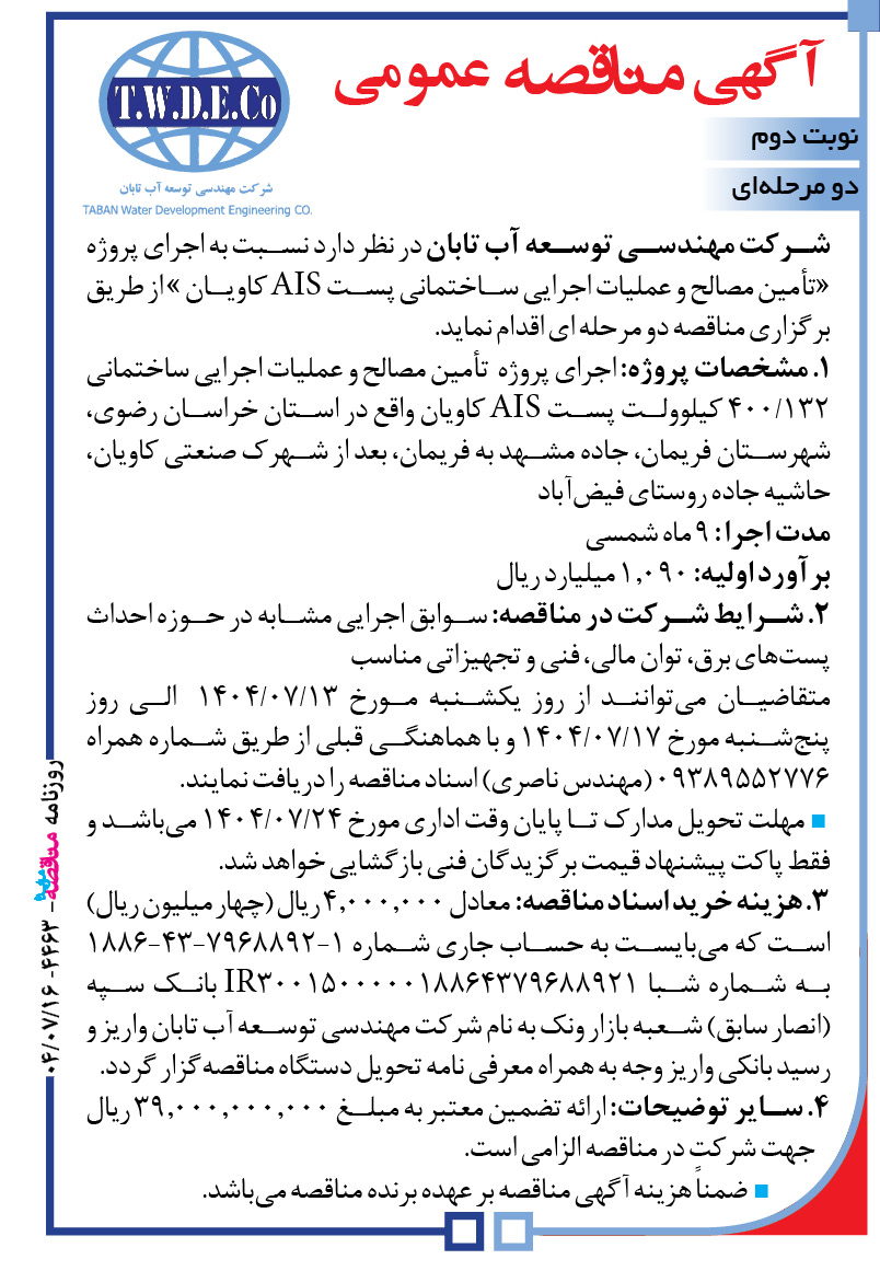 آگـهـی مـنـاقـصـه عـمـومـی دو مرحلهای شرکت مهندسی توسعه آب تابان در نظر دارد نسبت به اجرای پروژه «تأمین مصالح و عملیات اجرایی ساختمانی پست AIS کاویان » از طریق برگزاری مناقصه دو مرحله ای اقدام نماید. مشخصات پروژه: اجرای پروژه تأمین مصالح و عملیات اجرایی ساختمانی ۱۳۲/۴۰۰ کیلوولت پست AIS کاویان واقع در استان خراسان […]