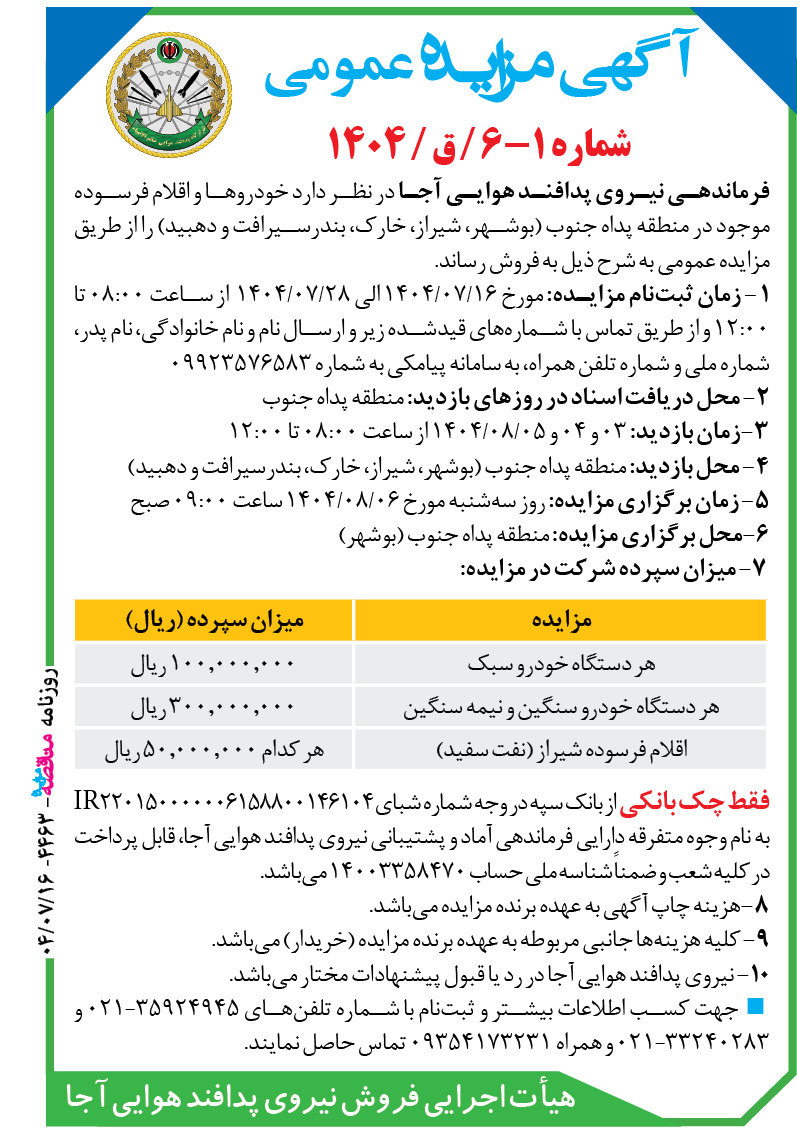 فرماندهی نیروی پدافند هوایی آجا در نظر دارد خودروها و اقلام فرسوده موجود در منطقه پداه جنوب (بوشهر، شیراز، خارک، بندرسیرافت و دهبید) را از طریق مزایده عمومی به شرح ذیل به فروش رساند.