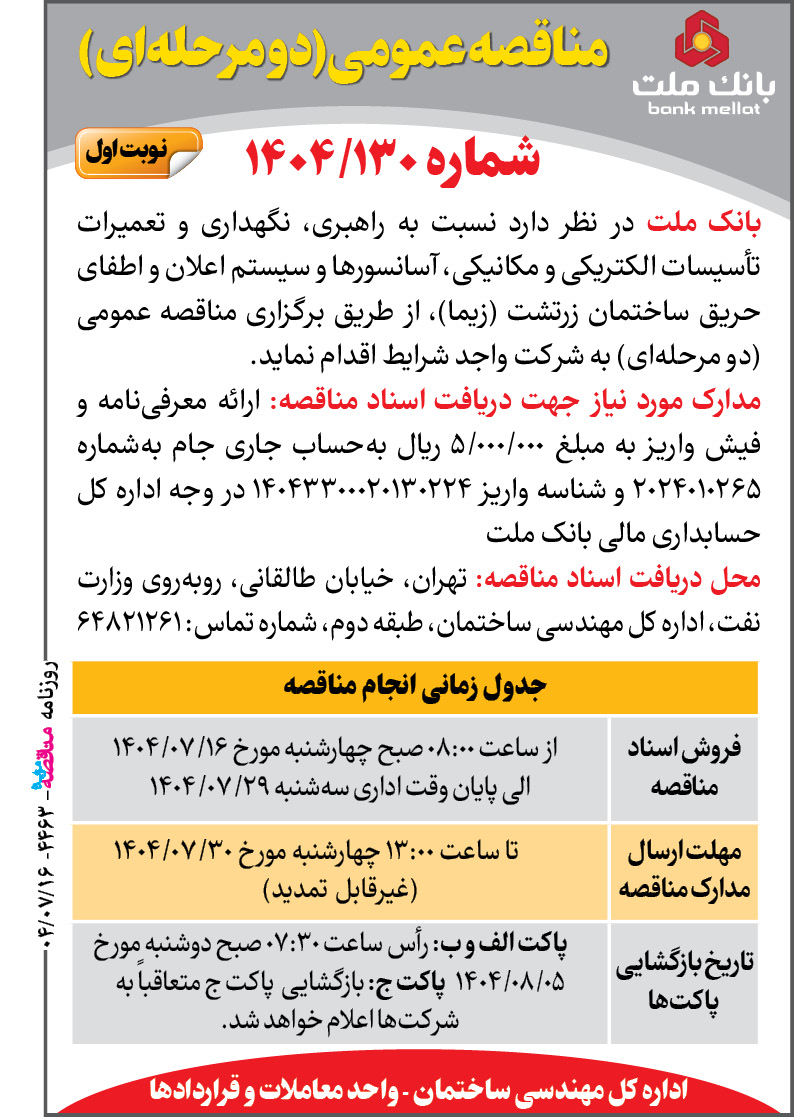 بانک ملت در نظر دارد نسبت به راهبری، نگهداری و تعمیرات تاسیسات الکتریکی و مکانیکیريال آسانسورها و سیستم اعلان و اطفا حریق ساختمان زرتشت (زیما)، از طریق برگزاری مناقصه عمومی (دو مرحله ای) به شرکت واجد شرایط اقدام نماید.