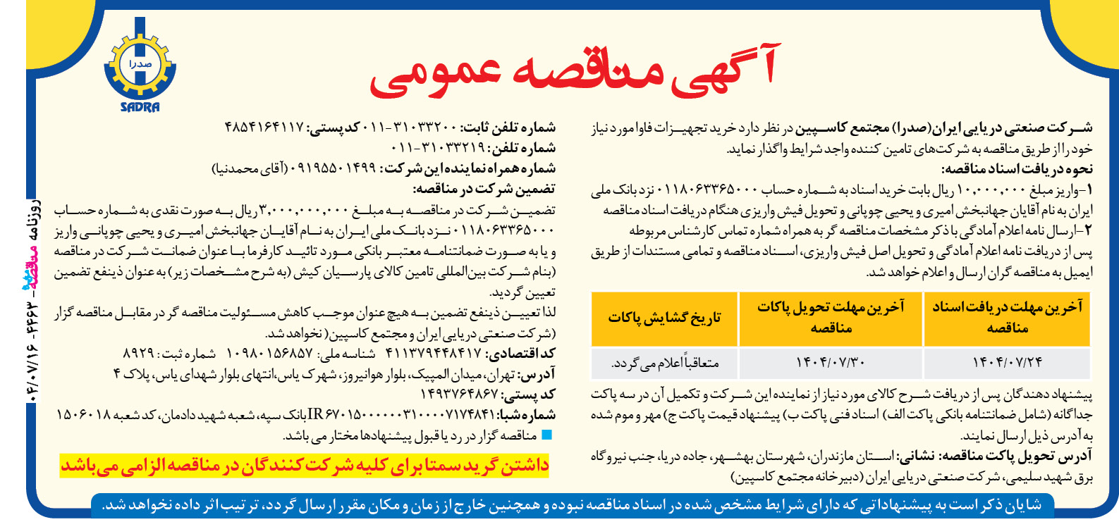 شرکت صنعتی دریایی ایران(صدرا) مجتمع کاسپین در نظر دارد خرید تجهیزات فاوا مورد نیاز خود را از طریق مناقصه به شرکتهای تامین کننده واجد شرایط واگذار نماید.
