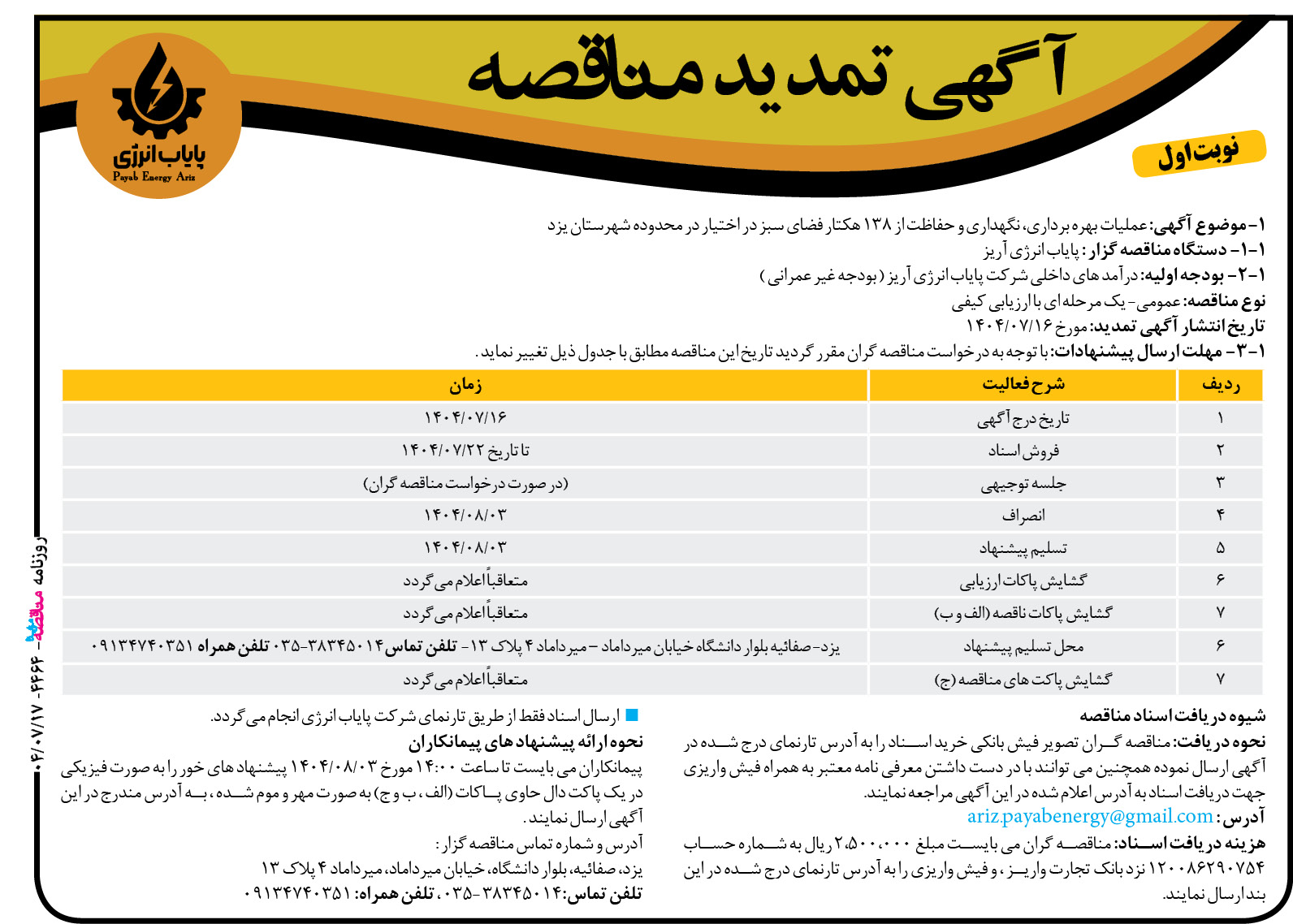 تاریخ انتشار آگهی تمدید: مورخ ۱۶/۰۷/۱۴۰۴
