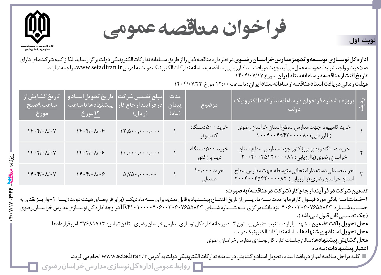 اداره کل نوسازی توسعه و تجهیز مدارس خراسان رضوی در نظر دارد مناقصه ذیل را از طریق سامانه تدارکات الکترونیکی دولت برگزار نماید .لذا از کلیه شرکتهای دارای صلاحیت و واجد شرایط دعوت به عمل می آید جهت دریافت اسناد ارزیابی و مناقصه به سامانه تدارکات الکترونیک دولت به آدرس www.setadiran.ir مراجعه نمایند.