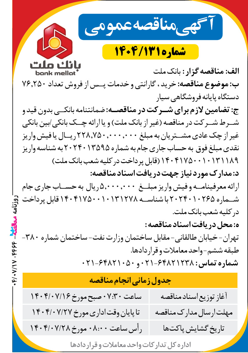 ب: موضوع مناقصه: خرید ، گارانتی و خدمات پس از فروش تعداد ۷۶٫۲۵۰ دستگاه پایانه فروشگاهی سیار