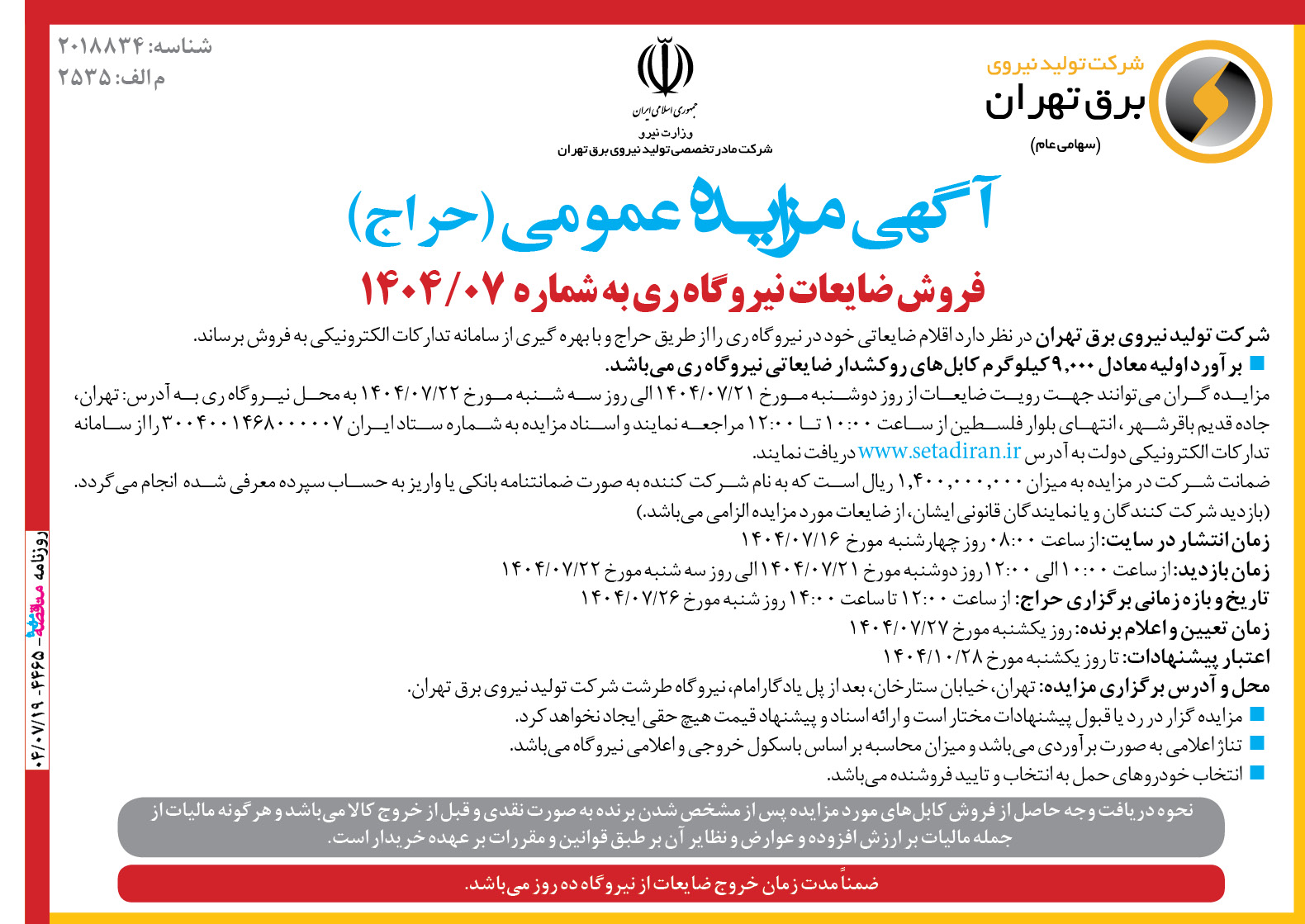 مزایده گران میتوانند جهت رویت ضایعات از روز دوشنبه مورخ ۲۱/۰۷/۱۴۰۴ الی روز سه شنبه مورخ ۲۲/۰۷/۱۴۰۴ به محل نیروگاه ری به آدرس: تهران، جاده قدیم باقرشهر ، انتهای بلوار فلسطین از ساعت ۱۰:۰۰ تا ۱۲:۰۰ مراجعه نمایند و اسناد مزایده به شماره ستاد ایران ۳۰۰۴۰۰۱۴۶۸۰۰۰۰۰۷ را از سامانه تدارکات الکترونیکی دولت به آدرس www.setadiran.ir دریافت نمایند. ضمانت شرکت در مزایده به میزان۱٫۴۰۰٫۰۰۰٫۰۰۰ ریال است که به نام شرکت کننده به صورت ضمانتنامه بانکی یا واریز به حساب سپرده معرفی شده انجام میگردد. (بازدید شرکت کنندگان و یا نمایندگان قانونی ایشان، از ضایعات مورد مزایده الزامی میباشد.)