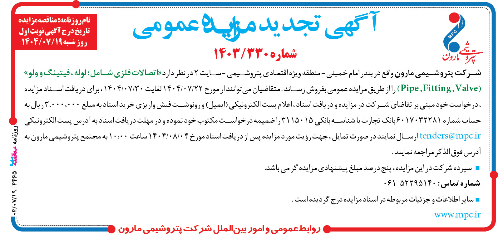 آگهي تجديد مزايده عمومي» شماره ۳۳۰/۱۴۰۳ شرکت پتروشيمي مارون واقع در بندر امام خميني – منطقه ويژه اقتصادي پتروشيمي – سايت ۲ در نظر دارد “ اتصالات فلزی شامل : لوله ، فيتينگ و ولو ” (Pipe , Fitting , Valve ) را از طريق مزايده عمومي بفروش رساند . متقاضيان ميتوانند از مورخ […]