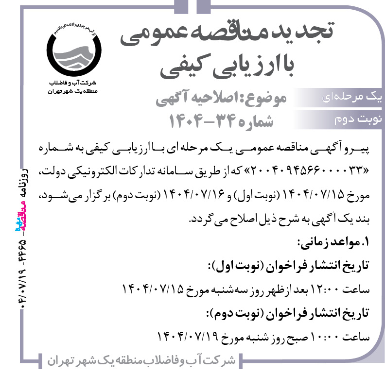 نوبت دوم آگهي تجدید مناقصه عمومي يك مرحله اي با ارزيابي كيفي موضوع: اصلاحیه آگهی شماره ۳۴-۱۴۰۴ پیرو آگهي مناقصه عمومي يك مرحله اي با ارزيابي كيفي به شماره «۲۰۰۴۰۹۴۵۶۶۰۰۰۰۳۳» که از طريق سامانه تداركات الكترونيكي دولت، مورخ ۱۵/۰۷/۱۴۰۴ (نوبت اول) و ۱۶/۰۷/۱۴۰۴ (نوبت دوم) برگزار میشود، بند یک آگهی به شرح ذیل اصلاح میگردد. […]