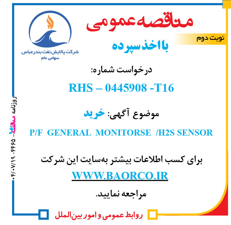 اگهی مناقصه عمومی با اخذ سپرده درخواست شماره: RHS – ۰۴۴۵۹۰۸ -T16 موضوع آگهی: خرید P/F GENERAL MONITORSE /H2 S SENSOR برای کسب اطلاعات بیشتر به سایت این شرکت WWW.BAORCO.IR مراجعه نمایید. روابط عمومی و امور بین الملل