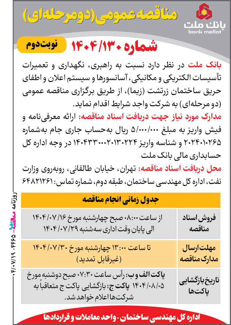 مناقصه عمومی (دو مرحله ای) شماره ۱۳۰/۱۴۰۴ بانک ملت در نظر دارد نسبت به راهبری، نگهداری و تعمیرات تاسیسات الکتریکی و مکانیکیريال آسانسورها و سیستم اعلان و اطفا حریق ساختمان زرتشت (زیما)، از طریق برگزاری مناقصه عمومی (دو مرحله ای) به شرکت واجد شرایط اقدام نماید. مدارک مورد نیاز جهت دریافت اسناد مناقصه: ارائه معرفی […]
