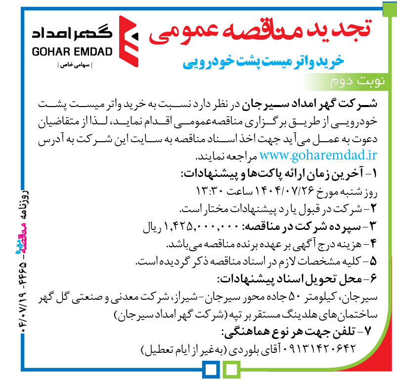 شرکت گهر امداد سیرجان در نظر دارد نسبت به خرید واتر میست پشت خودرویی از طریق برگزاری مناقصهعمومی اقدام نماید، لذا از متقاضیان دعوت به عمل میآید جهت اخذ اسناد مناقصه به سایت این شرکت به آدرس www.goharemdad.ir مراجعه نمایند.
