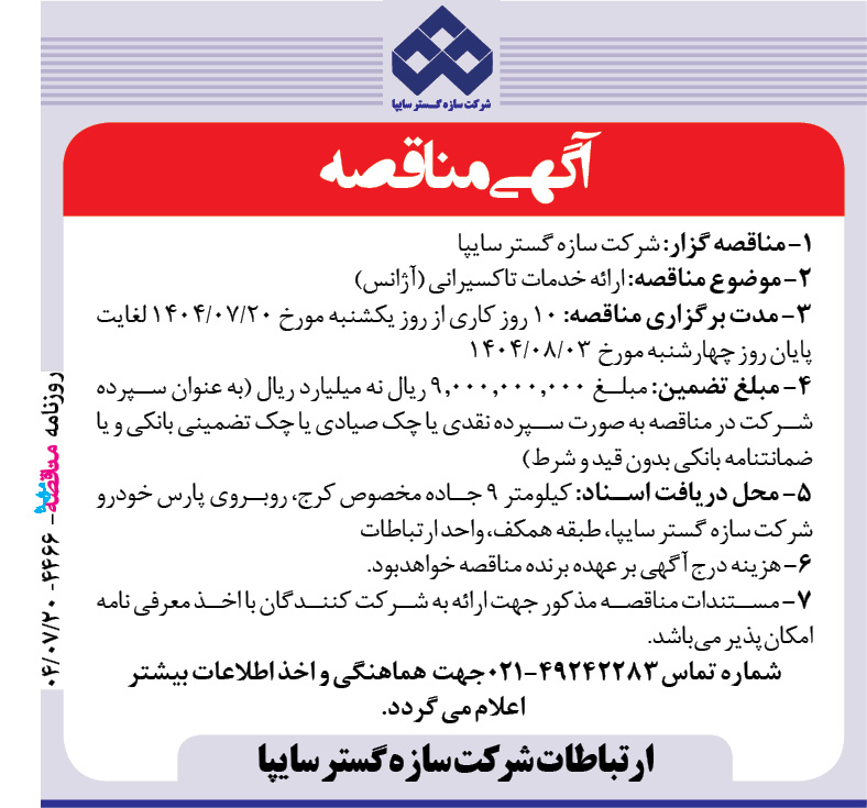 آگهی مناقصه مناقصه گزار: شرکت سازه گستر سایپا موضوع مناقصه:ارائه خدمات ایاب و ذهاب پرسنل مدت برگزاری مناقصه : ۱۰ روز کاری از روز یکشنبه مورخ ۲۰/۰۷/۱۴۰۴ لغایت پایان روز چهارشنبه مورخ ۰۳/۰۸/۱۴۰۴ مبلغ تضمین: مبلغ ۷٫۰۰۰٫۰۰۰٫۰۰۰ ریال هفت میلیارد ریال (به عنوان سپرده شركت در مناقصه به صورت سپرده نقدی يا چک صیادی يا […]