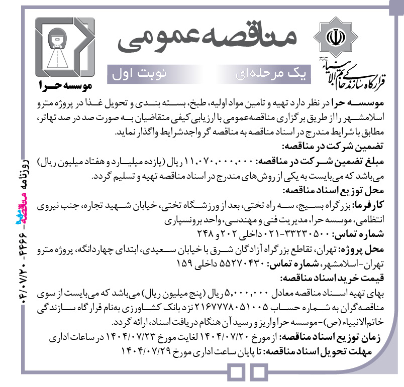 موسسه حرا در نظر دارد تهیه و تامین مواد اولیه، طبخ، بسته بندی و تحویل غذا در پروژه مترو اسلامشهر را از طریق برگزاری مناقصهعمومی با ارزیابیکیفی متقاضیان به صورت صد در صد تهاتر، مطابق با شرایط مندرج در اسناد مناقصه به مناقصه گر واجدشرایط واگذار نماید.