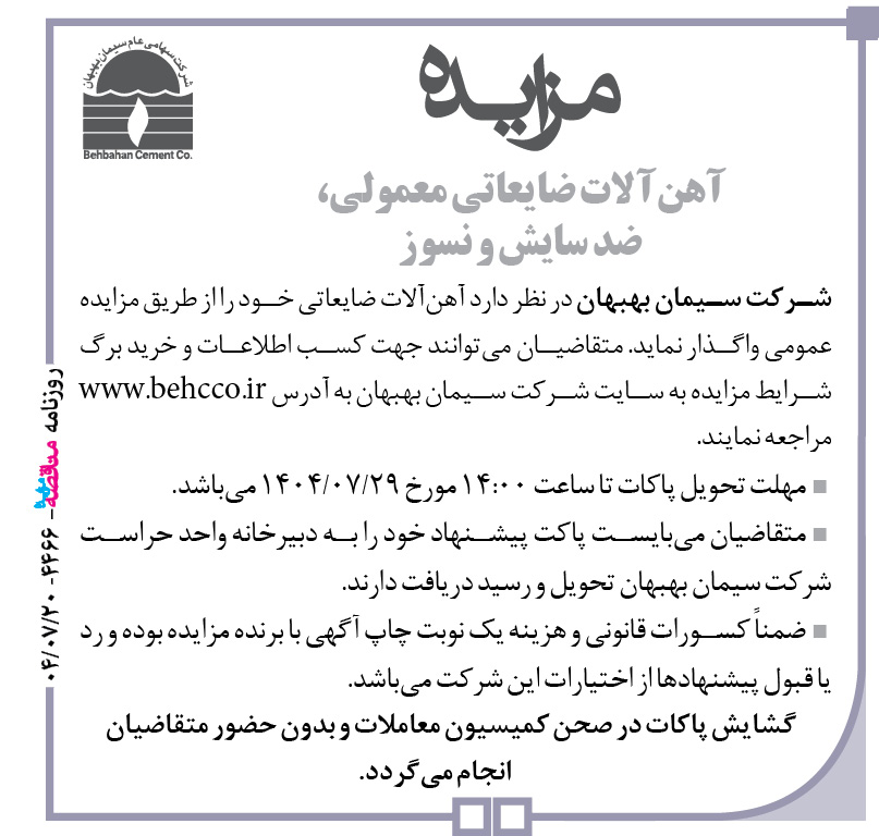 شرکت سیمان بهبهان در نظر دارد آهنآلات ضایعاتی خود را از طریق مزایده عمومی واگذار نماید. متقاضیان میتوانند جهت کسب اطلاعات و خرید برگ شرایط مزایده به سایت شرکت سیمان بهبهان به آدرس www.behcco.ir مراجعه نمایند. مهلت تحویل پاکات تا ساعت ۱۴:۰۰ مورخ ۲۹/۰۷/۱۴۰۴ میباشد. متقاضیان میبایست پاکت پیشنهاد خود را به دبیرخانه واحد حراست شرکت سیمان بهبهان تحویل و رسید دریافت دارند. ضمناً کسورات قانونی و هزینه یک نوبت چاپ آگهی با برنده مزایده بوده و رد یا قبول پیشنهادها از اختیارات این شرکت میباشد.