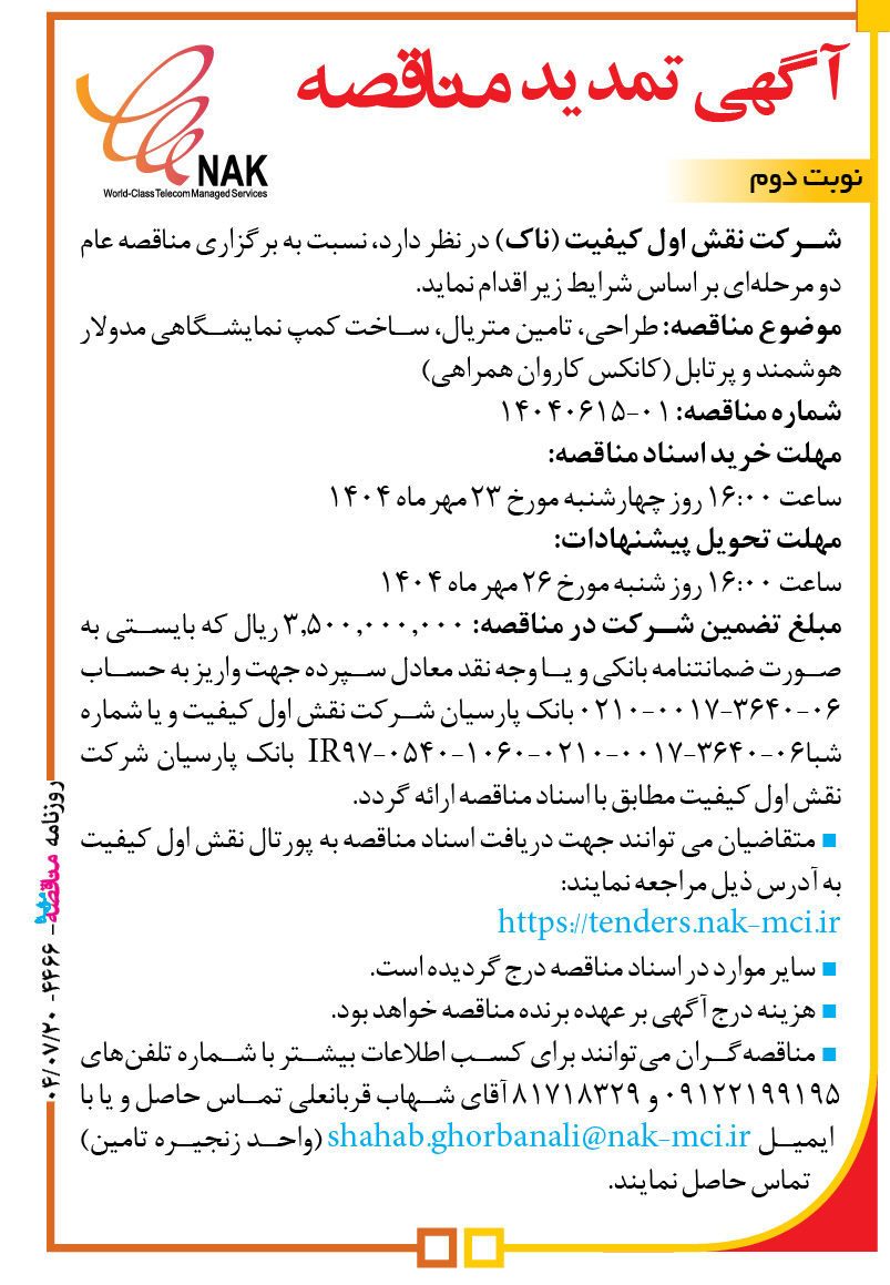 تمدید آگهی مناقصه (نوبت دوم) شرکت نقش اول کیفیت (ناک) در نظر دارد، نسبت به برگزاری مناقصه عام دو مرحلهای بر اساس شرایط زیر اقدام نماید. موضوع مناقصه: طراحی، تامین متریال، ساخت کمپ نمایشگاهی مدولار هوشمند و پرتابل(کانکس کاروان همراهی) شماره مناقصه: ۰۱-۱۴۰۴۰۶۱۵ مهلت خرید اسناد مناقصه: ساعت ۱۶:۰۰ روز چهارشنبه مورخ ۲۳ مهر ماه […]