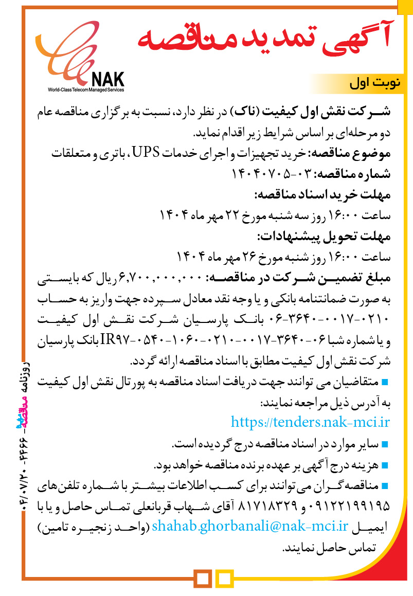 تمدید آگهی مناقصه (نوبت اول) شرکت نقش اول کیفیت (ناک) در نظر دارد، نسبت به برگزاری مناقصه عام دو مرحلهای بر اساس شرایط زیر اقدام نماید. موضوع مناقصه: خرید تجهیزات و اجرای خدمات UPS ، باتری و متعلقات شماره مناقصه: ۰۳-۱۴۰۴۰۷۰۵ مهلت خرید اسناد مناقصه: ساعت ۱۶:۰۰ روز سه شنبه مورخ ۲۲ مهر ماه […]