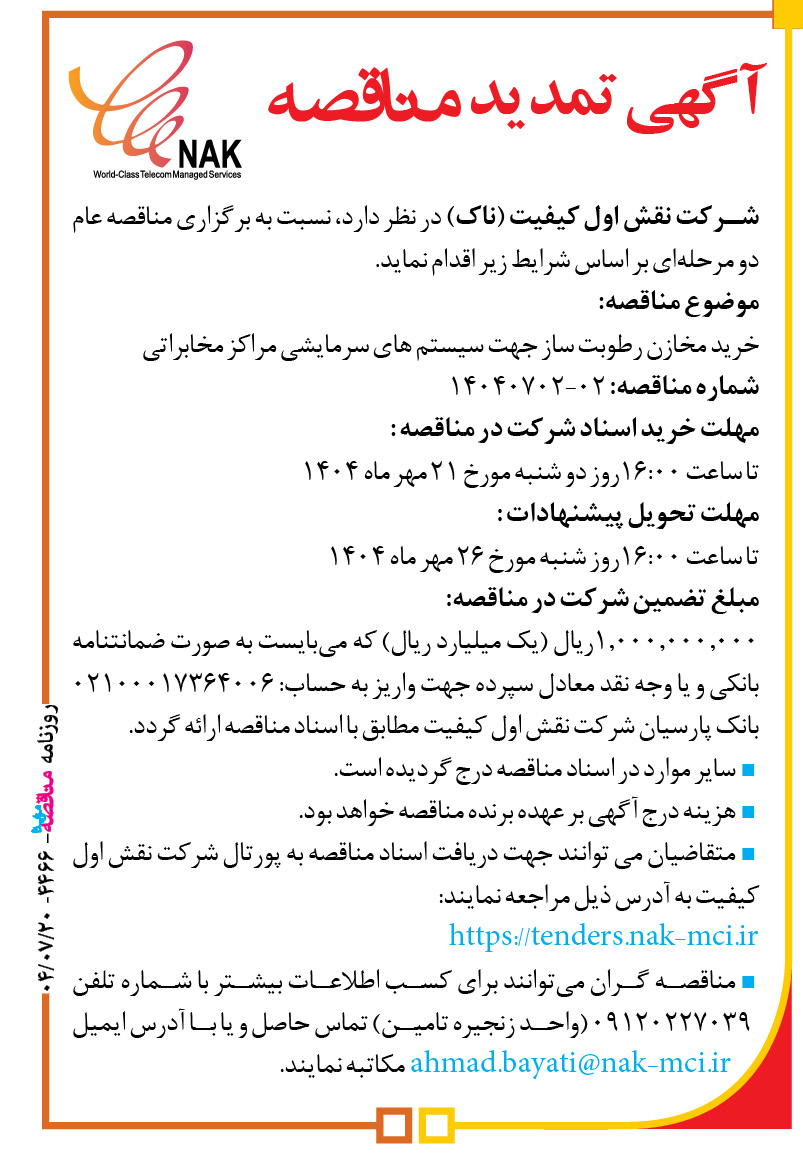 مناقصه گران میتوانند برای کسب اطلاعات بیشتر با شماره تلفن ۰۹۱۲۰۲۲۷۰۳۹ (واحد زنجیره تامین) تماس حاصل و یا با آدرس ایمیل ahmad.bayati@nak-mci.ir مکاتبه نمایند.