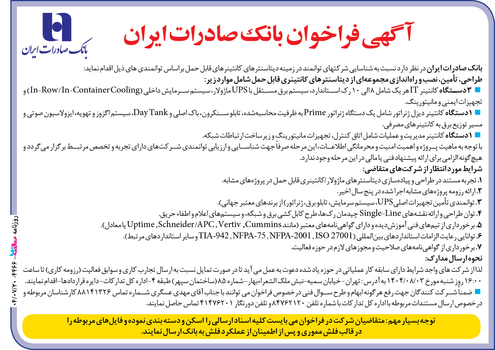 بانک صادرات ايران در نظر دارد نسبت به شناسایی شرکتهای توانمند در زمینه دیتاسنترهای کانتینرهای قابل حمل براساس توانمندی های ذیل اقدام نمايد: