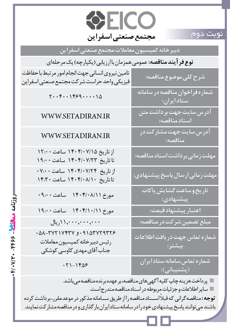 دبیرخانه کمیسیون معاملات مجتمع صنعتی اسفراین نوع فرآیند مناقصه: عمومی همزمان با ارزیابی (یکپارچه) یک مرحلهای خرید ۲۰۰ تن فروسیلیس شرح کلی موضوع مناقصه: ۲۰۰۴۰۰۱۴۶۹۰۰۰۰۱۴ شماره فراخوان مناقصه در سامانه ستاد ایران: WWW.SETADIRAN.IR آدرس سایت جهت برداشت متن اسناد مناقصه: WWW.SETADIRAN.IR آدرس سایت جهت مشارکت در مناقصه: از تاریخ ۰۹/۰۷/۱۴۰۴ ساعت ۱۶:۳۰ تا تاریخ ۱۹/۰۷/۱۴۰۴ […]