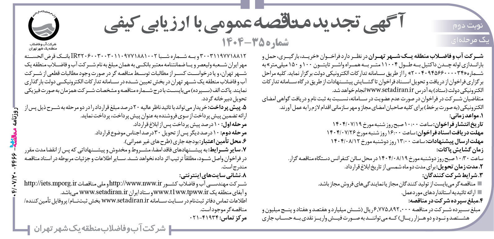نوبت دوم آگهي تجدید مناقصه عمومي يك مرحله اي با ارزيابي كيفي موضوع: اصلاحیه آگهی شماره ۳۴-۱۴۰۴ پیرو آگهي مناقصه عمومي يك مرحله اي با ارزيابي كيفي به شماره «۲۰۰۴۰۹۴۵۶۶۰۰۰۰۳۳» که از طريق سامانه تداركات الكترونيكي دولت، مورخ ۱۵/۰۷/۱۴۰۴ (نوبت اول) و ۱۶/۰۷/۱۴۰۴ (نوبت دوم) برگزار میشود، بند یک آگهی به شرح ذیل اصلاح میگردد. […]
