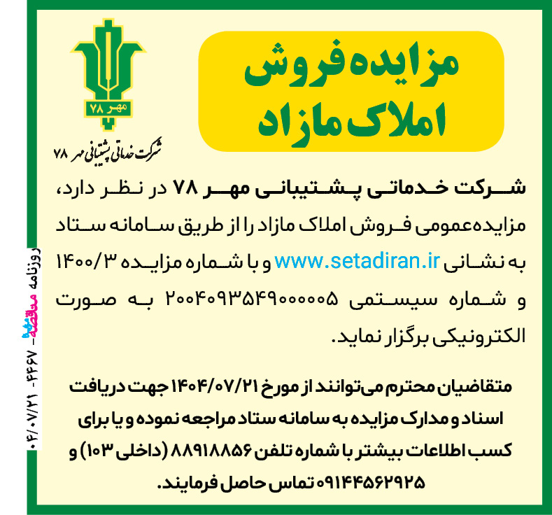 شرکت خدماتی پشتیبانی مهر ۷۸ در نظر دارد، مزایدهعمومی فروش املاک مازاد را از طریق سامانه ستاد به نشانی www.setadiran.ir و با شماره مزایده ۳/۱۴۰۰ و شماره سیستمی ۲۰۰۴۰۹۳۵۴۹۰۰۰۰۰۵ به صورت الکترونیکی برگزار نماید.