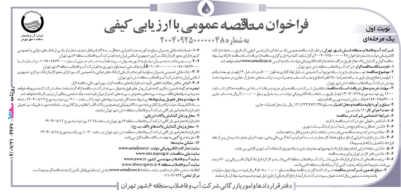شركت آب و فاضلاب منطقه شش شهر تهران در نظر دارد مناقصه عمومي يك مرحله اي با ارزيابي كيفي را از طريق سامانه تداركات الكترونيكي دولت به شماره فراخوان ۲۰۰۴۰۹۲۵۰۰۰۰۰۰۴۸ برگزار نمايد. كليه مراحل برگزاري مناقصه از دريافت اسناد مناقصه تا ارائه پيشنهاد مناقصه گران و گشایش پاكتها از طريق درگاه سامانه تداركات الكترونيكي دولت (ستاد) به آدرس www.setadiran.ir انجام خواهد شد.