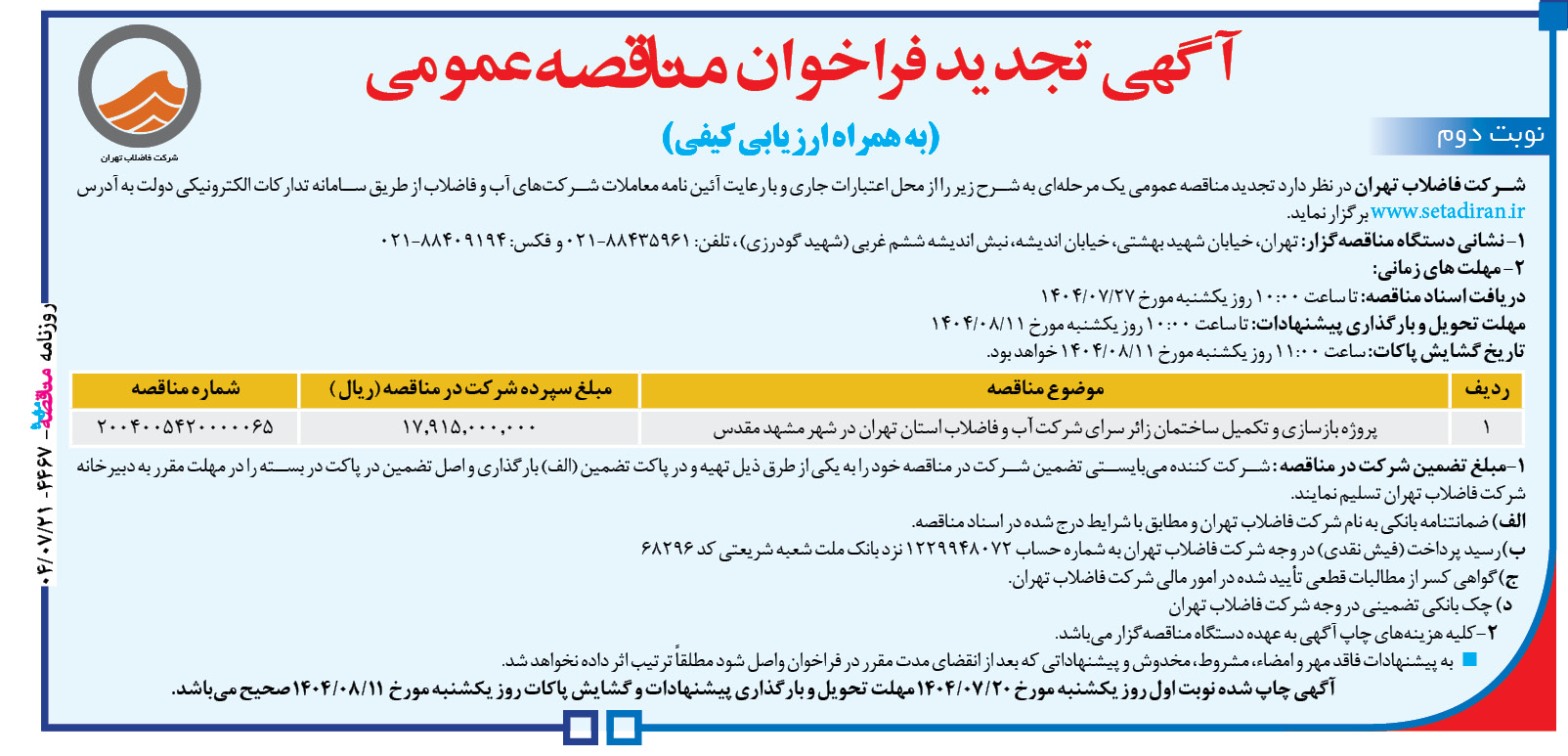 شركت فاضلاب تهران در نظر دارد تجدید مناقصه عمومی یک مرحلهای به شرح زیر را از محل اعتبارات جاری و با رعايت آئین نامه معاملات شرکتهای آب و فاضلاب از طریق سامانه تدارکات الکترونیکی دولت به آدرس www.setadiran.ir برگزار نماید.