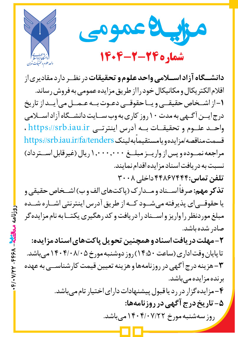 دانشگاه آزاد اسلامی واحد علوم و تحقیقات در نظر دارد مقادیری از اقلام الکتریکال و مکانیکال خود را از طریق مزایده عمومی به فروش رساند.