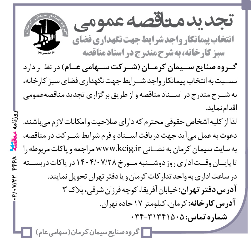 گروه صنایع سیمان کرمان (شرکت سهامی عام) در نظر دارد نسبت به انتخاب پیمانکار واجد شرایط جهت نگهداری فضای سبز کارخانه، به شرح مندرج در اسناد مناقصه و از طریق برگزاری تجدید مناقصهعمومی اقدام نماید. لذا از کلیه اشخاص حقوقی محترم که دارای صلاحیت و امکانات لازم میباشند. دعوت به عمل میآید جهت دریافت اسناد و فرم شرایط شرکت در مناقصه، به سایت سیمان کرمان به نشانی www.kcig.ir مراجعه و پاکات مربوطه را تا پایان وقت اداری روز دوشنبه مورخ ۲۸/۰۷/۱۴۰۴ در پاکات دربسته در ساعت اداری به واحد تدارکات کرمان و یا دفتر تهران تحویل نمایند.