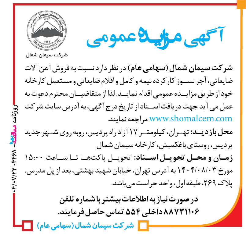 شرکت سیمان شمال (سهامی عام) در نظر دارد نسبت به فروش آهن آلات ضایعاتی، آجر نسوز کارکرده نیمه و کامل و اقلام ضایعاتی و مستعمل کارخانه خود از طریق مزایده عمومی اقدام نماید. لذا از متقاضیان محترم دعوت به عمل می آید جهت دریافت اسناد از تاریخ درج آگهی، به آدرس سایت شرکت www.shomalcem.com مراجعه نمایند.
