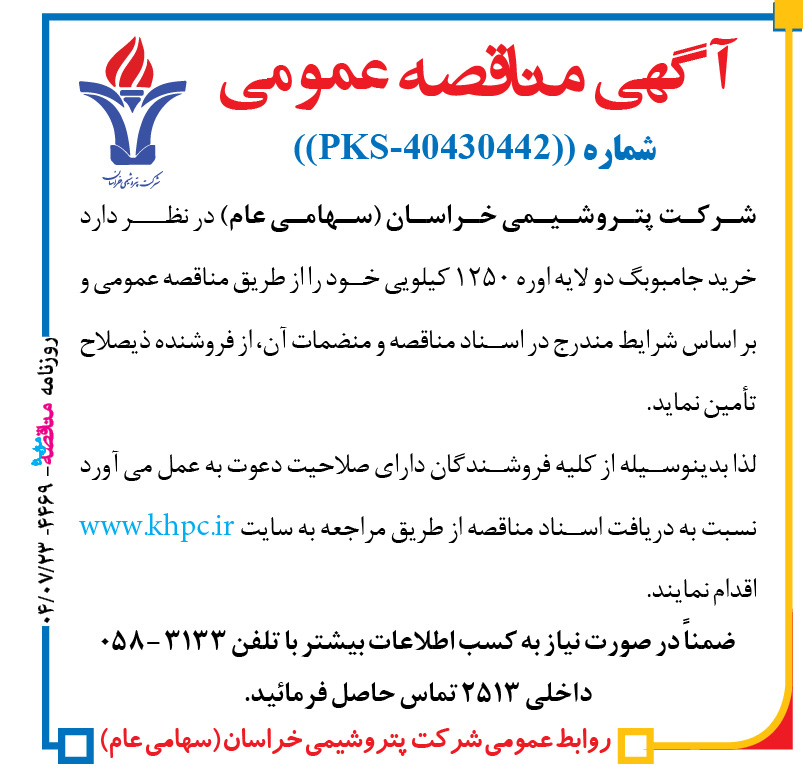 شركت پتروشيمي خراسان (سهامي عام) در نظر دارد خريد جامبوبگ دو لايه اوره ۱۲۵۰ كيلويي خود را از طریق مناقصه عمومی و بر اساس شرایط مندرج در اسناد مناقصه و منضمات آن، از فروشنده ذیصلاح تأمين نمايد. لذا بدينوسيله از كليه فروشندگان داراي صلاحيت دعوت به عمل مي آورد نسبت به دريافت اسناد مناقصه از طريق مراجعه به سايتwww.khpc.ir اقدام نمايند. ضمناً در صورت نياز به كسب اطلاعات بيشتر با تلفن ۳۱۳۳ -۰۵۸ داخلي ۲۵۱۳ تماس حاصل فرمائيد.