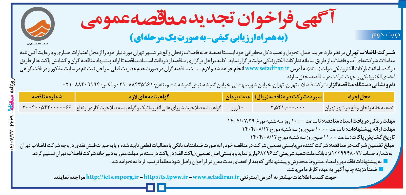 جهت کسب اطلاعات بیشتر به آدرس اینترنتی http://iets.mporg.ir – http://ts.tpww.ir – www.setadiran.ir