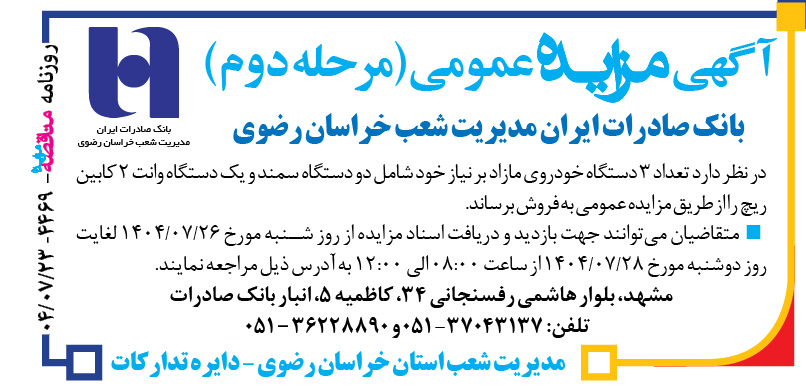 در نظر دارد تعداد ۳ دستگاه خودروی مازاد بر نیاز خود شامل دو دستگاه سمند و یک دستگاه وانت ۲ کابین ریچ را از طریق مزایده عمومی به فروش برساند.
